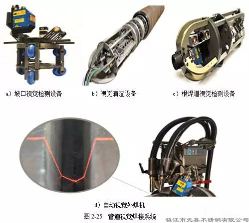 新型的不銹鋼管道焊接系統(tǒng)集成了激光視覺焊接和檢測技術(shù)。該系統(tǒng)主要包括以下組件:坡口加工站應(yīng)用的坡口視覺檢測設(shè)備(見圖2-25a),合金鋼管焊接時背部用來控制和監(jiān)視清理艙室參數(shù)的視覺清渣設(shè)備(見圖2-25b),焊接工作站應(yīng)用的根焊道視覺檢測設(shè)備(見圖2-25c),以及具有自適應(yīng)焊接控制技術(shù)的視覺外焊機(見圖2-25d)。四種組件均采用激光視覺技術(shù)同時工作,從而將管道自動焊接工藝的質(zhì)量和速度提高到前所未有的水平。
