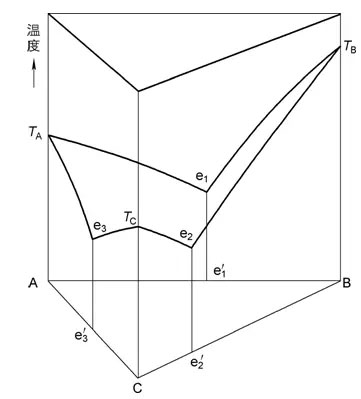 這樣構成的立體相圖線條異常雜亂,圖1還只是畫出了三個二元系的側邊,當三元相圖內(nèi)部結構也畫出時,整個圖形就更加復雜難以表達和閱讀,因此通常不直接用這種立體相圖,而用它的投影。