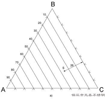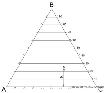 同樣的,在圖4中, B角對面的AC邊上含B的組成為零,平行于AC邊畫平行線表示B的含量。S點距離底邊的垂直距離22,因此就含B為22%。