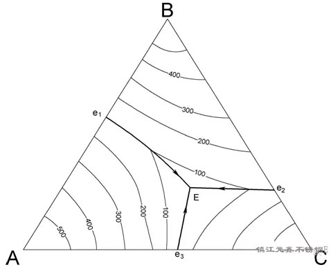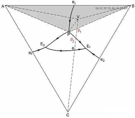 立體相圖投影以后,變成三角形的平面圖,溫度的坐標表現(xiàn)不出來了,通常采取畫等溫線的辦法來彌補(如圖2中的細線),在線上標以溫度的數(shù)值(圖中的數(shù)值是假設的)。這就意味著凡是在這條線上所有坐標點的溫度是相同的。此外,一些有溫度變化的曲線,如圖中的e1-E,e2-E, e3-E等還在曲線上面畫上箭頭,表示溫度下降的方向。