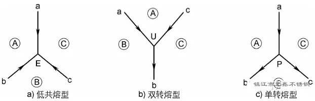 圖a)是低共熔型,低共熔點的特征符號是E。三條二元低共熔線aE,bE和cE匯聚在低共熔點E,箭頭方向表示溫度的降低,所以低共熔點的溫度最低。特征是三個箭頭指向同一個低共熔點的“三聚”。圖中圓圈中的大寫英文字母是相應的固相。E點的化學反應是: