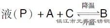 圖c)是單轉熔型。單轉點的特征符號為P。帶箭頭曲線的特征是:“一聚兩離”。P點的化學反應的溫度是不變的,是個等溫過程。它的化學反應有兩種寫法:P點化學反應剛剛開始時是: