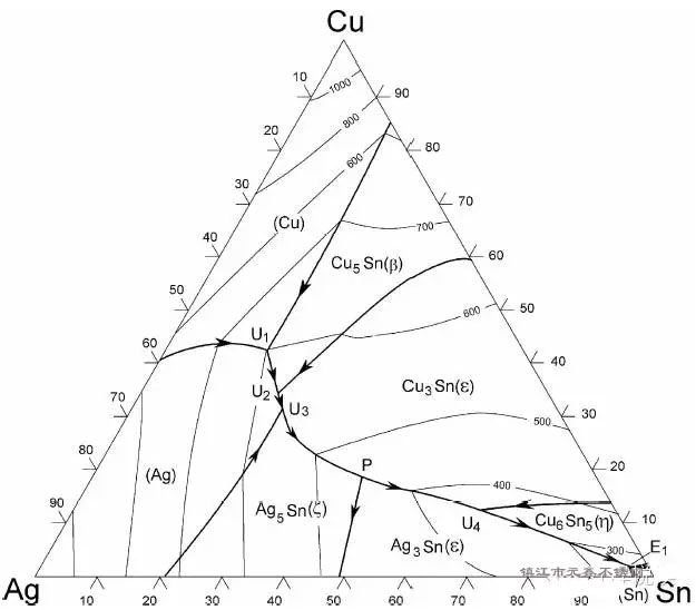 圖7所示的Ag-Cu-Sn三元系是一個同時具有多個E、U和P三種特征四相平衡點的典型體系,各位看官可試分析一下,分析結果請參見《三元合金相圖手冊》。