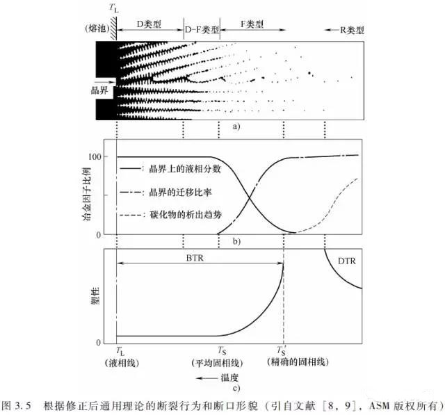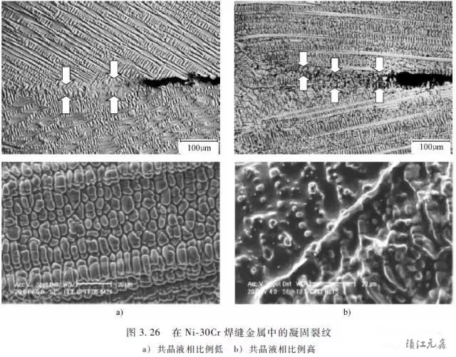 圖30.26a所示的一組照片中,顯示的是在凝固末端,焊縫金屬具有相對(duì)較低(<5%)的共晶液相,對(duì)應(yīng)的斷口表面表現(xiàn)出很明顯的樹(shù)枝晶特征。圖3.26b所示的一組照片中,顯示的是在凝固末端,焊縫金屬形成了大約10%的共晶液相,這么高的液相比例分?jǐn)?shù),由于回填作用,導(dǎo)致斷口表面被這些液相所覆蓋,隱約可以看到一些樹(shù)枝晶特性。