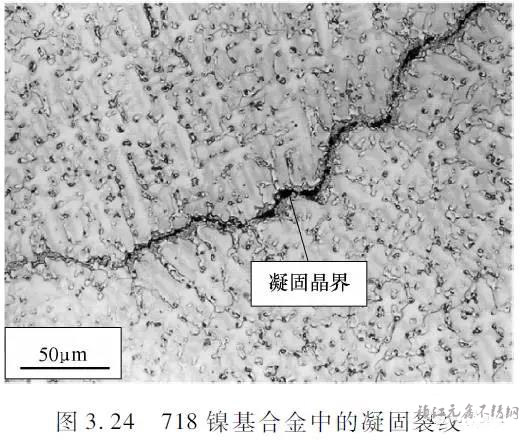 通常情況下,以?shī)W氏體(面心立方)為初生相凝固的材料比以鐵素體(體心立方)為初生相凝固的材料對(duì)凝固裂紋更為敏感。屬于這種規(guī)律的材料中,包括大多數(shù)的奧氏體不銹鋼、部分結(jié)構(gòu)鋼以及全部的鎳基合金。圖3.24所示的例子是一個(gè)718鎳基高溫合金,718合金(Ni-20Cr-15Fe-5Nb-3Mo)是通過(guò)添加Nb來(lái)實(shí)現(xiàn)析出強(qiáng)化。大多數(shù)鎳基合金中的Nb偏析會(huì)產(chǎn)生一個(gè)共晶反應(yīng),導(dǎo)致最終的凝固組織是由NbC、富Nb的Laves相或者是由這些相的混合物所組成的。Nb偏析產(chǎn)生的凈效應(yīng)是擴(kuò)大了凝固溫度范圍,并且提高了裂紋敏感性。沿著凝固晶界的連續(xù)液態(tài)薄膜的痕跡非常明顯,如圖3.24所示,其中含有NbC,并且有可能存在Laves相。