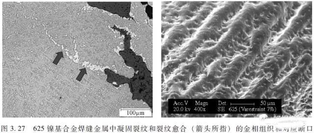 圖3.27所示為名義合金成分Ni-22Cr-9Mo-3.5Nb的625鎳基填充金屬的焊縫凝固裂紋的一組金相和斷口照片。如前所述,在鎳基合金凝固過(guò)程中,Nb會(huì)強(qiáng)烈地再分配,并在凝固末期促進(jìn)γ/NbC共晶相和(或)Laves相形成,出現(xiàn)足夠多的共晶液相,會(huì)促進(jìn)液相沿著凝固晶界回填,如圖3.27中的箭頭所指。斷口形貌反映出了表面上所出現(xiàn)的這些共晶液相,應(yīng)當(dāng)指出,樹(shù)枝晶特征并不十分明顯,這是因?yàn)樵嫉臉?shù)枝晶表面已經(jīng)被覆蓋在其上的共晶液相所罩住。