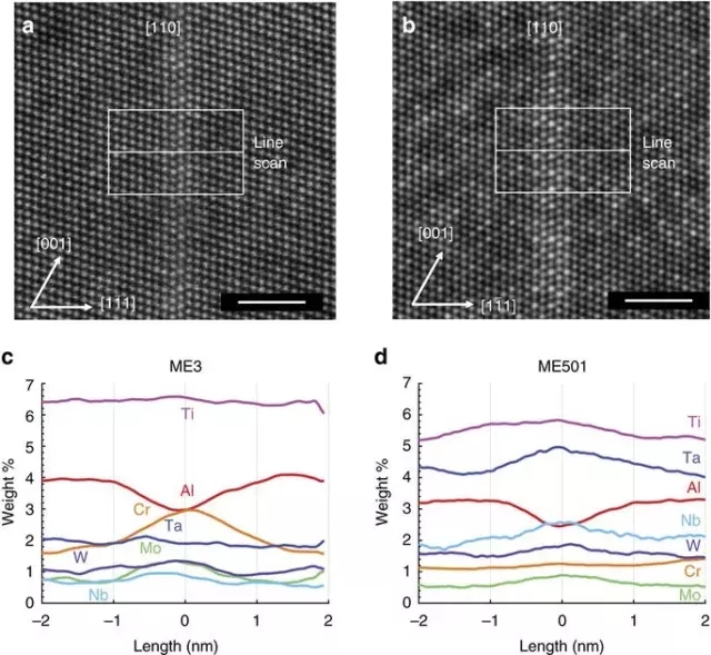 圖2:在ME3和ME501中沿層錯(cuò)偏析。在[110]晶帶軸上獲得的HAADF-STEM圖像揭示(a)沿ME3中的超晶格外部堆垛層錯(cuò)的偏析和(b)沿ME501中的超晶格外部堆垛層錯(cuò)的η相的偏析和“網(wǎng)格狀”順序。集成的EDX線掃描顯示分別沿著(c)ME3和(d)ME501的超晶格外部堆垛層錯(cuò)的元素偏析,如(a,b)中所示。未給出在這兩種情況下Co的富集和沿著層錯(cuò)的Ni含量的耗損,標(biāo)尺為2nm。