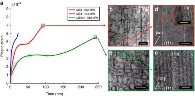 圖1:壓縮蠕變數(shù)據(jù)和變形機(jī)制。(a)分別為ME3和ME501在760℃和552MPa(分別為藍(lán)色和綠色)和ME3在414MPa(紅色)下的[001]壓縮蠕變曲線,以實(shí)現(xiàn)可比的應(yīng)變速率(5×10-9 s-1)。[001]晶帶軸BF-STEM圖像揭示了在后[001]蠕變(b) ME3和(c)ME501晶體中的孤立的超晶格外部堆垛層錯(cuò)和納米孿晶。HAADF-STEM圖像顯示(d)ME3中的納米孿晶和(e)ME501中的超晶格外部堆垛層錯(cuò)。(d)圖顯示了更高放大倍率的ME3中的孿晶界面。 b,c,標(biāo)為500nm。d,標(biāo)尺為5nm(插圖,2nm)。 e,標(biāo)尺為2 nm。