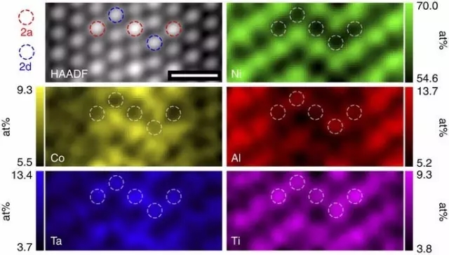 圖3:在ME501合金中跨越超晶格外部堆垛層錯(cuò)高分辨率元素分布圖。在γ'相中的兩層堆垛層錯(cuò)處形成的η相的原子尺度的量子化原子分辨率EDX元素分布圖。左上圖是層錯(cuò)內(nèi)顯示特征排序強(qiáng)度的層錯(cuò)HAADF-STEM圖像; Ni亞晶格(綠色); 偏析到Ni位點(diǎn)的Co(黃色);偏析到Wyckoff 2a位點(diǎn)的Ta(藍(lán)色);Al和Ti(分別是紅色和洋紅色),偏析到Wyckoff 2d位點(diǎn)。所有元素值均為原子百分含量。標(biāo)尺為0.5nm。