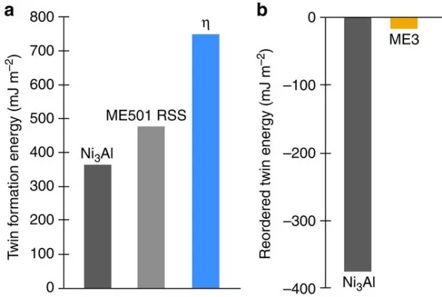 圖5:超晶格外部堆垛層錯(cuò)和納米孿晶動(dòng)力學(xué)DFT計(jì)算。(a)在實(shí)驗(yàn)中觀察到,通過(guò)在具有隨機(jī)固溶體的Ni3Al中,ME501中的重新排序之前沿著超晶格外部堆垛層錯(cuò)剪切的孿晶形成的能量消耗,即沒(méi)有偏析(RSS),并且ME501,其中η沿著層錯(cuò)形核,的。注意沿著具有η相的超晶格外部堆垛層錯(cuò)形成孿晶的能量消耗較大。(b)孿晶生成后由于重排序產(chǎn)生的能量差異。 ME3較小的差異表明,替代Ni和Al的γ相形成元素(Co,Cr和Mo)的偏析已經(jīng)去除了層錯(cuò)附近的沉淀物中的最鄰近的違規(guī),使得ME3的孿生更容易。