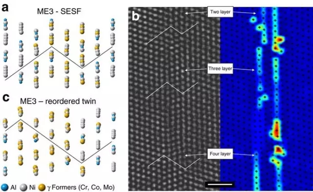 ME3與ME501相比,它表現(xiàn)出較差的蠕變強(qiáng)度。這與上述研究結(jié)果相一致,因?yàn)閮H在ME3中觀察到納米孿生。為了更深入地了解超晶格外部堆垛層錯(cuò)s和納米孿生之間的關(guān)系,以及原子排列的作用,不同元素的分布的位點(diǎn)特異性分析是必不可少的。