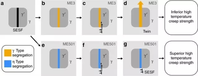 圖6:ME501中的相變強(qiáng)化。(a)在γ'相沉淀物中孤立的SESF的示意圖。(b)γ形成元素(Co,Cr和Mo)沿ME3中的SESF偏析。(c)在ME3中的SESF附近的γ-γ'界面處,兩個(gè)以上的位錯(cuò)發(fā)生相互作用。(d)兩個(gè)更多的肖克利不全位錯(cuò)沿著SESF剪切,形成能夠剪切γ和γ'沉淀物的四層孿晶 (e)在ME501中沿著SESF偏析的η相形成元素(Co,Ta,Ti和Nb)。 (f)在ME501中的SESF附近的γ-γ'界面處,兩個(gè)以上的位錯(cuò)發(fā)生相互作用。(g)圖5中,位錯(cuò)在ME501中不能形成孿晶。