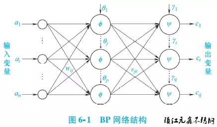 BP神經(jīng)網(wǎng)絡(luò)是一種單向傳播的多層前向網(wǎng)絡(luò),網(wǎng)絡(luò)除輸入輸出結(jié)點(diǎn)外,還包括一層或多層隱含節(jié)點(diǎn),同層內(nèi)節(jié)點(diǎn)之間沒(méi)有任何聯(lián)系。輸入信號(hào)從輸入層節(jié)點(diǎn)依次傳過(guò)各隱含層節(jié)點(diǎn),然后傳到輸出節(jié)點(diǎn),每一層節(jié)點(diǎn)的輸出只影響到下一層節(jié)點(diǎn)的輸出。基本BP算法主要包括兩個(gè)過(guò)程:信號(hào)的前向傳播以及誤差的反向傳播。即由輸入通過(guò)BP網(wǎng)絡(luò)計(jì)算實(shí)際輸出是按前向進(jìn)行,而修正權(quán)值和閾值的過(guò)程是按從輸出到輸入逆向進(jìn)行。圖6-1為標(biāo)準(zhǔn)的三層BP神經(jīng)網(wǎng)絡(luò)模型結(jié)構(gòu)圖。