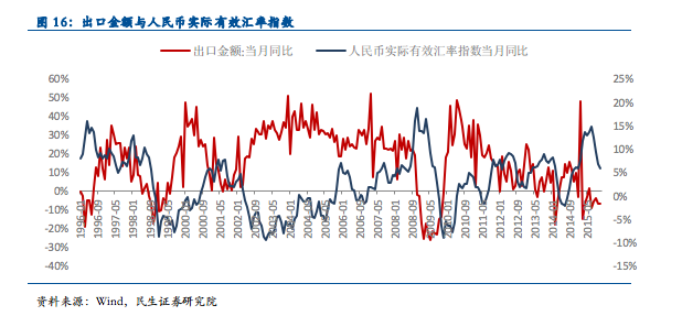 報(bào)告提出,從1997年至今中國(guó)人民幣實(shí)際有效匯率同比和出口同比增速的關(guān)系來(lái)看,人民幣實(shí)際有效匯率同比變化領(lǐng)先于出口增速半年左右。但隨著全球經(jīng)濟(jì)形勢(shì)、貿(mào)易條件的變化, 人民幣貶值對(duì)出口的促進(jìn)作用在減弱。