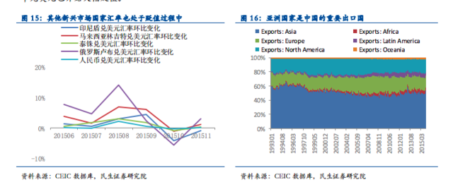 本輪人民幣貶值過(guò)程的同時(shí),當(dāng)前許多新興市場(chǎng)國(guó)家由于面臨資本流出風(fēng)險(xiǎn),其貨幣也同樣處于貶值過(guò)程之中。在美元升值、油價(jià)暴跌、商品價(jià)格下滑的背景下,俄羅斯盧布暴跌,馬來(lái)西亞、印度、泰國(guó)和印尼的貨幣均遭拋售,這些貶值都將弱化人民幣貶值對(duì)中 國(guó)的提振作用。多數(shù)新興市場(chǎng)國(guó)家匯率走勢(shì)與人民幣保持一致。除此之外,發(fā)達(dá)國(guó)家的貨幣兌美元也開(kāi)始大幅貶值。