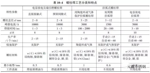 表10⁃4 給出了各種螺柱焊工藝的特點(diǎn)和應(yīng)用范圍, 在工藝方法的選擇中可以參考。