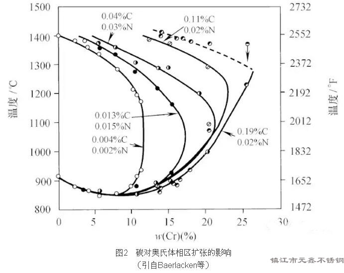 元素,它使γ相回線區(qū)擴(kuò)大,即在鉻含量高得多的成分下仍使奧氏體在高溫區(qū)保持穩(wěn)定。圖2示出了碳對(duì)擴(kuò)大奧氏體相區(qū)的影響,請(qǐng)注意即使很少的碳含量,也可使γ相回線區(qū)顯著地?cái)U(kuò)大,這對(duì)于開(kāi)發(fā)馬氏體鋼很重要,因?yàn)橐诶鋮s時(shí)形成馬氏體,則在高溫時(shí)鋼必須是奧氏體。而對(duì)于鐵素體類(lèi)鋼,γ相回線面積必須予以控制,使得高溫時(shí)沒(méi)有或者只有很少奧氏體存在。
