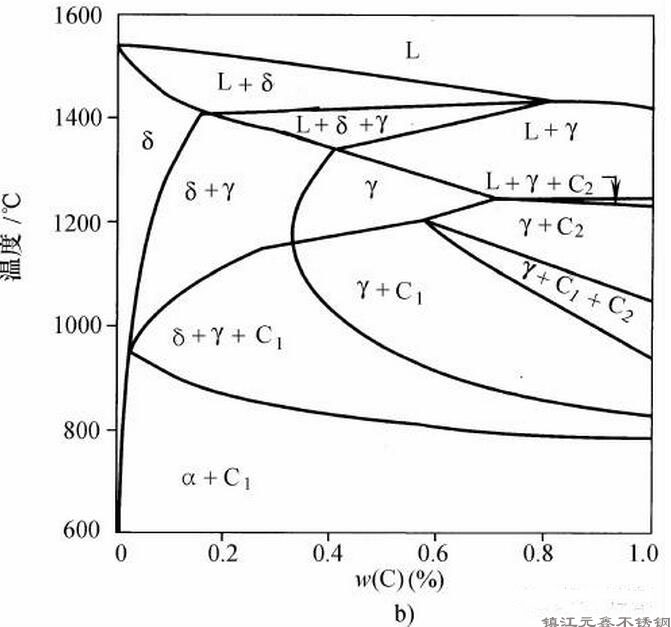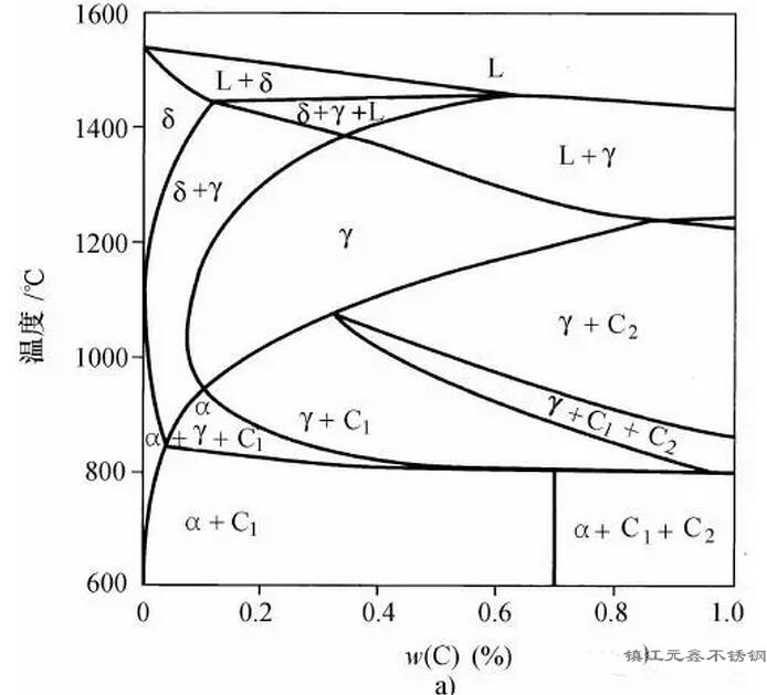 把碳加入鐵-鉻系,顯著改變了平衡相圖使其復(fù)雜化。由于碳是奧氏體形成