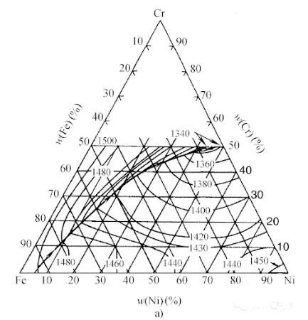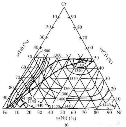 液相面在圖4a上顯示了一條從相圖三角形靠近富Fe角的點(diǎn)出發(fā)到Cr-Ni邊的粗黑曲線。這條曲線把凝固成鐵素體初始析出相的成分和凝固成奧氏體初始析出相的成分區(qū)分開(kāi)來(lái)。在接近48Cr-44Ni-8Fe的成分點(diǎn)形成了一個(gè)三元共晶點(diǎn)。