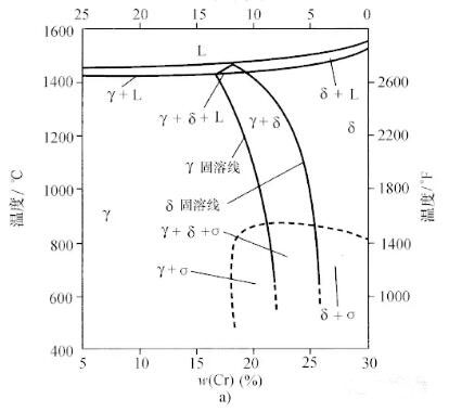 因?yàn)殂t是不銹鋼的主要合金元素,所以把圖1所示的鐵-鉻系相圖作為討論不銹鋼相平衡的起點(diǎn)。注意相圖中Cr在高溫時(shí)全部溶于鐵中,所有Fe-Cr合金凝固時(shí)都生成鐵素體。而凝固溫度區(qū)間很窄。對(duì)低鉻含量的合金在912~1394℃ 溫度區(qū)間形成一個(gè)奧氏體區(qū),通常被稱(chēng)為γ相回線。鉻的質(zhì)量分?jǐn)?shù)高于12.7%的合金在高溫時(shí)全是鐵素體,而鉻的質(zhì)量分?jǐn)?shù)低于12.7%的合金在這個(gè)γ相回線溫度范圍內(nèi)多多少少要形成一些奧氏體。而鉻的質(zhì)量分?jǐn)?shù)低于12%的合金在此回線的溫度范圍內(nèi)將是全奧氏體組織,形成的奧氏體在快速冷卻時(shí)可轉(zhuǎn)變成馬氏體。在Fe-Cr系中存在一種稱(chēng)為σ相的低溫平衡相,這種相是具有(Fe,Cr)化