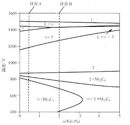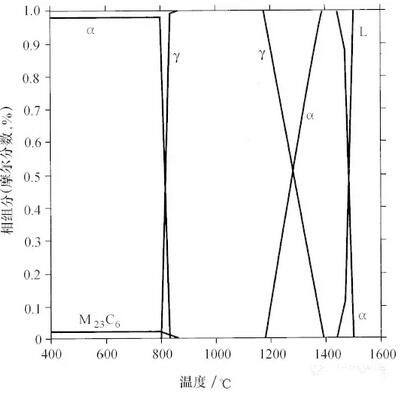 (質(zhì)量分?jǐn)?shù)) 為12Cr=0.5MO-0.5Si-0.1C的典型410型馬氏體不銹鋼的相圖。這
