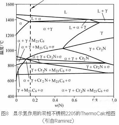 圖8給出了另外一個(gè)例子,這是以氮作為成分變量由計(jì)算得到的雙相不銹鋼2205的相圖。一個(gè)典型的氮的質(zhì)量分?jǐn)?shù)是0.15%,圖上以一根垂直虛線表示。由圖可知即使在高溫,合金也不能得到全鐵素體組織,而微觀組織中總有一些奧氏體存在,這就可以有效地減少在焊接熱影響區(qū)鐵素體的長(zhǎng)大。圖中也示出