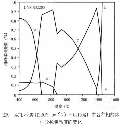 請(qǐng)注意圖9指出:在低于大約900℃ 的溫度時(shí),σ相是一種平衡相。盡管在鐵-鉻系合金中σ相形成得很緩慢,但在Fe-Cr-Ni系含鐵素體的不銹鋼中,特別是在Cr、Mo含量較高、在大約700℃時(shí)σ相的形成要快得多。雙相鋼的這種特性加上鐵素體含量又高,使其對(duì)形成σ相而產(chǎn)生的脆化很敏感。為了避免由鐵素體形成σ相,要求在大致為900~500℃ 的溫度范圍內(nèi)快速冷卻。雙相鋼的這種特性也使其高溫加工包括焊后熱處理受到限制。