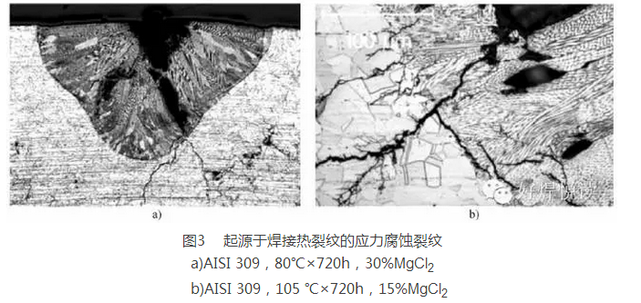最后應(yīng)當(dāng)指出,某種材料在某種焊接工藝條件下,具有產(chǎn)生多種裂紋的可能,所以常在同一條裂紋上或在相近的部位產(chǎn)生不同性質(zhì)的裂紋。有時(shí)在熱裂紋或冷裂紋的基礎(chǔ)上發(fā)展成為應(yīng)力腐蝕裂紋或?qū)訝钏毫训,如圖3所示為起源于焊接熱裂紋上的應(yīng)力腐蝕裂紋。因此需要作細(xì)致的分析,才能得出正確的判斷。