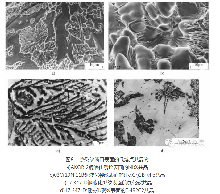 由于液化裂紋的形成與低熔點(diǎn)共晶間相的重熔液化或組分液化形成的晶間液膜有直接關(guān)系,所以液化裂紋的斷口上有開裂后液相沿晶界面凝固的痕跡。由于熱影響區(qū)晶界液化所形成的液相往往與基體成分相差很大,也不易形成很厚的液層,而且原奧氏體晶界面一般較平坦,所以液化裂紋斷口上不易出現(xiàn)發(fā)達(dá)的樹枝晶結(jié)構(gòu),而常常能觀察到的各種共晶在晶界面上凝固的典型形態(tài)。