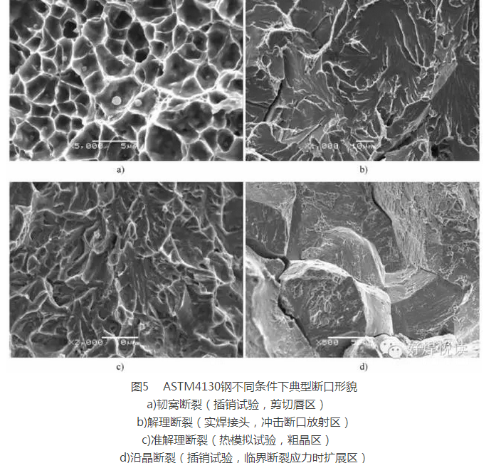 金屬材料的斷裂形式很多,因而斷口的形態(tài)也很復(fù)雜,如圖4所示。這里主要介紹與焊接裂紋有關(guān)的斷裂形式及斷口形態(tài),把各類裂紋中常見的韌窩斷裂、解理斷裂、準(zhǔn)解理斷裂、沿晶斷裂和氫致準(zhǔn)解理斷裂作簡(jiǎn)要介紹,其典型斷口形貌如圖5所示。