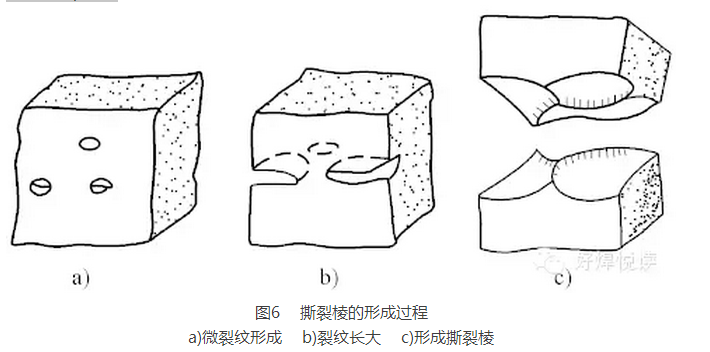 (3)準(zhǔn)解理斷裂(QuasiCleavage fracture,QC) 其斷口形貌類似于解理斷裂但又有區(qū)別,故稱準(zhǔn)解理斷裂。準(zhǔn)解理斷裂與解理斷裂一樣,都是穿晶型的斷裂,除具有脆性斷口的特征之外,還有明顯塑性變形的撕裂棱,如圖5c所示。撕裂棱是由許多單獨(dú)形核的微裂紋相互連接匯合而成,形成的過(guò)程如圖6所示。準(zhǔn)解理斷口的特征是短程的河流狀花樣,常在局部地區(qū)形成裂紋,又在該地區(qū)短程擴(kuò)展,形成大量短而彎曲的撕裂棱。有時(shí)在短程河流花樣之間出現(xiàn)二次裂紋。