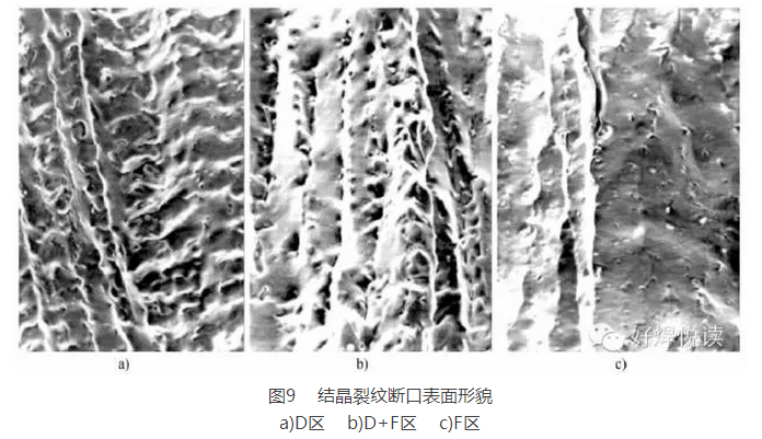 實(shí)際上,由于結(jié)晶裂紋形成時(shí),晶界面上有連續(xù)液層,而裂紋形成后如拉伸應(yīng)變持續(xù)增長(zhǎng),裂紋就會(huì)向晶間液層稍厚(即溫度較高)的區(qū)域以及晶間液層少而不連續(xù)(即溫度較低)的區(qū)域擴(kuò)展。因此結(jié)晶裂紋斷口的全貌是由具有不同特點(diǎn)的三個(gè)典型區(qū)域構(gòu)成的,根據(jù)日本學(xué)者松田、中川等對(duì)凝固裂紋斷口的劃分,這三個(gè)典型區(qū)域分別是樹枝狀斷口區(qū)(D區(qū))、平坦?fàn)顢嗫趨^(qū)(F區(qū))及它們之間的樹枝狀與平坦?fàn)罱M成的混合斷口區(qū)(D+F區(qū)),如圖9所示。