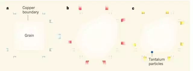 圖1 納米合金材料抗蠕變特性。Darling等人構(gòu)建了一種納米晶合金材料,這種材料擁有較高的高溫抗蠕變性能。a.合金內(nèi)的晶粒由晶界分開。b.當(dāng)長期在應(yīng)力作用下,銅原子擴(kuò)散到新的位置,增加了晶粒的尺寸。c.研究人員在晶界上填加了坦顆粒。當(dāng)長期在應(yīng)力作用下,晶粒的尺寸不再顯著增加,合金擁有了更好的抗蠕變性能。