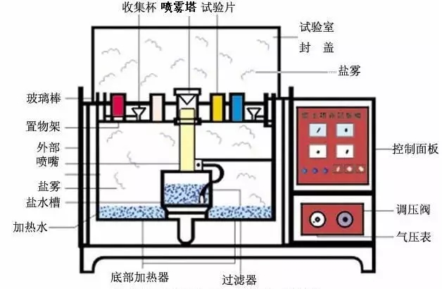 人工模擬鹽霧環(huán)境試驗(yàn)是利用一種具有一定容積空間的試驗(yàn)設(shè)備——鹽霧試驗(yàn)箱(如圖),在其容積空間內(nèi)用人工的方法,造成鹽霧環(huán)境來(lái)對(duì)產(chǎn)品的耐鹽霧腐蝕性能質(zhì)量進(jìn)行考核。